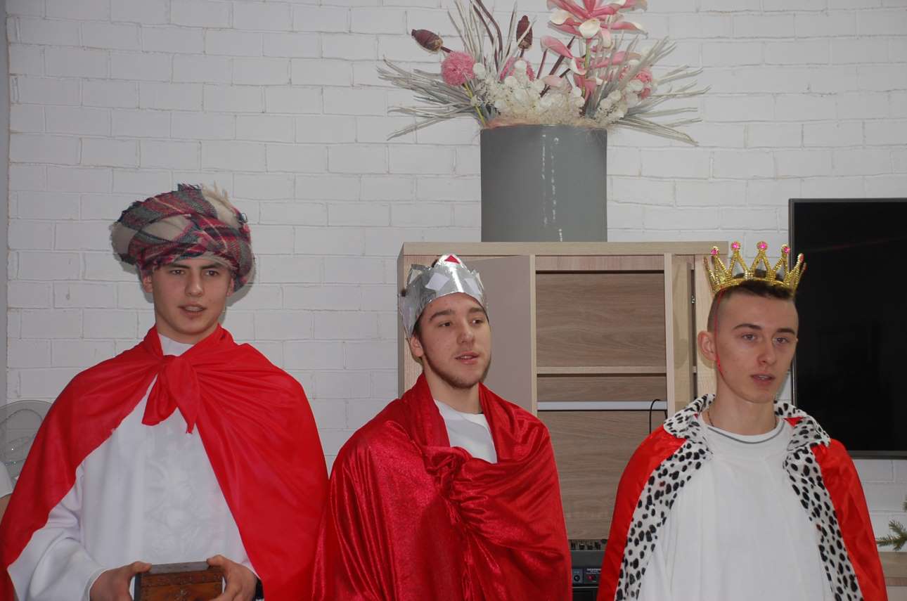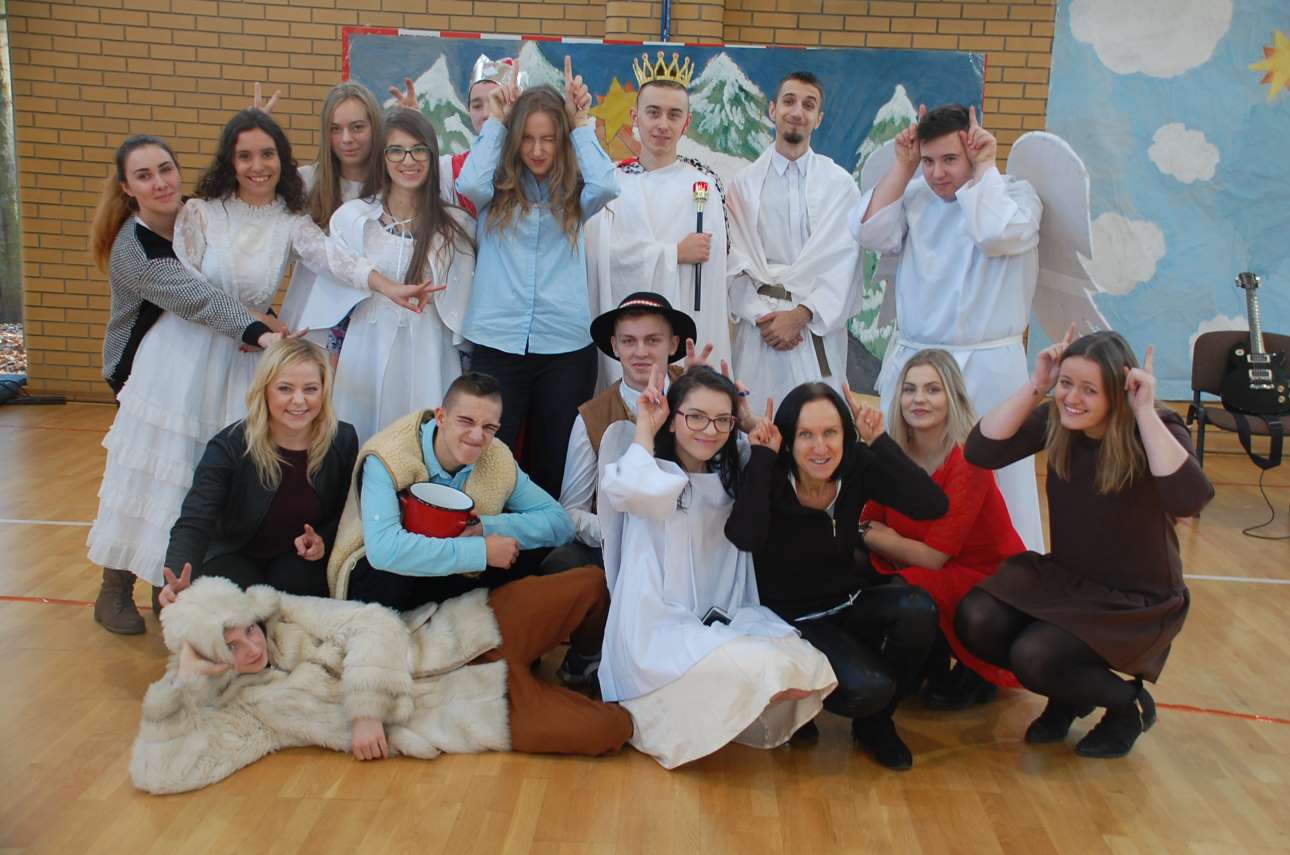 W czwartek- 22 grudnia zaprezentowaliśmy nasze jasełka w sali gimnastycznej dla całej szkolnej społeczności. Tłem do ukazywanych wydarzeń była piękna scenografia wykonana przez uczniów klasy pierwszej technikum, pod kierunkiem p.Karoliny Król-Mazurkiewicz . Jednym z naszych gości był obecny pracownik obornickiego Urzędu Gminy- Dawid Bernadek, który kilka lat temu opuścił mury naszej szkoły. Przypomniały mu się czasy, kiedy sam brał udział we wszelkich szkolnych uroczystościach i dlatego chętnie dołączył do występujących , by wspólnie zaśpiewać ulubioną kolędę „Bracia patrzcie jeno”.