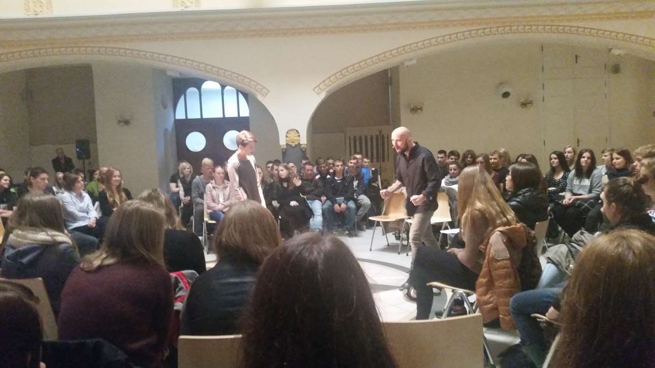 W listopadzie 2014 roku licealiści z klasy 3b obejrzeli spektakl muzyczny „Mordechaj Gebirtig”, który jest częścią projektu „Jidysz dla wszystkich” promującego kulturę jidysz w Polsce i Norwegii. Przedstawienie składa się z tekstów Mordechaja Gebirtiga – żydowskiego poety i pieśniarza. Zapach cebulowej zupy, rodzinne konflikty, miłość, radość życia, ale i smutek, codzienne troski, bieda składają się na barwny i wzruszający obraz przedwojennej Polski, której częścią była właśnie kultura jidysz. Mocy temu przedstawieniu dodaje fantastyczny występ Alicji Kalinowskiej i Tomasza Leszczyńskiego oraz wnętrze Synagogi Pod Białym Bocianem stwarzające niepowtarzalną atmosferę.