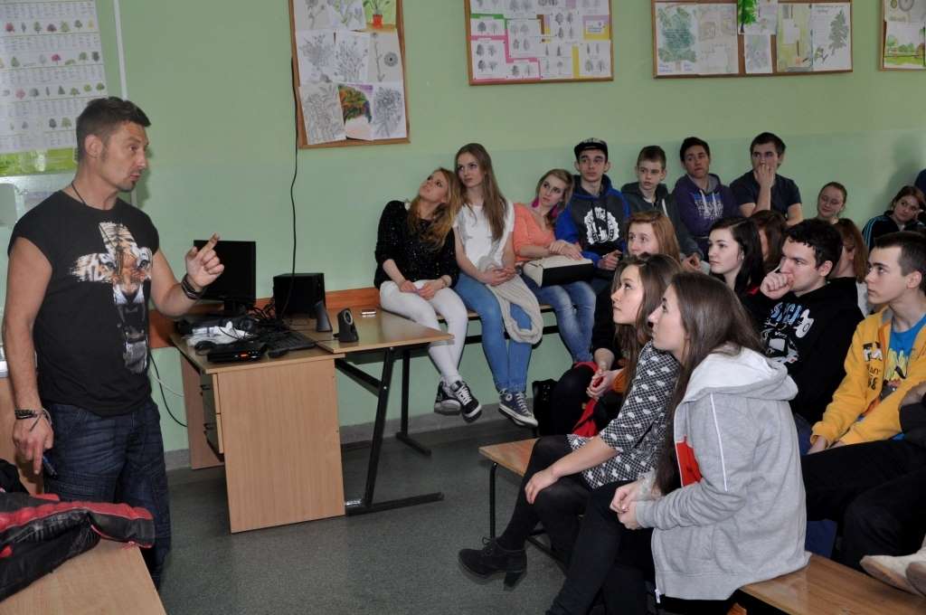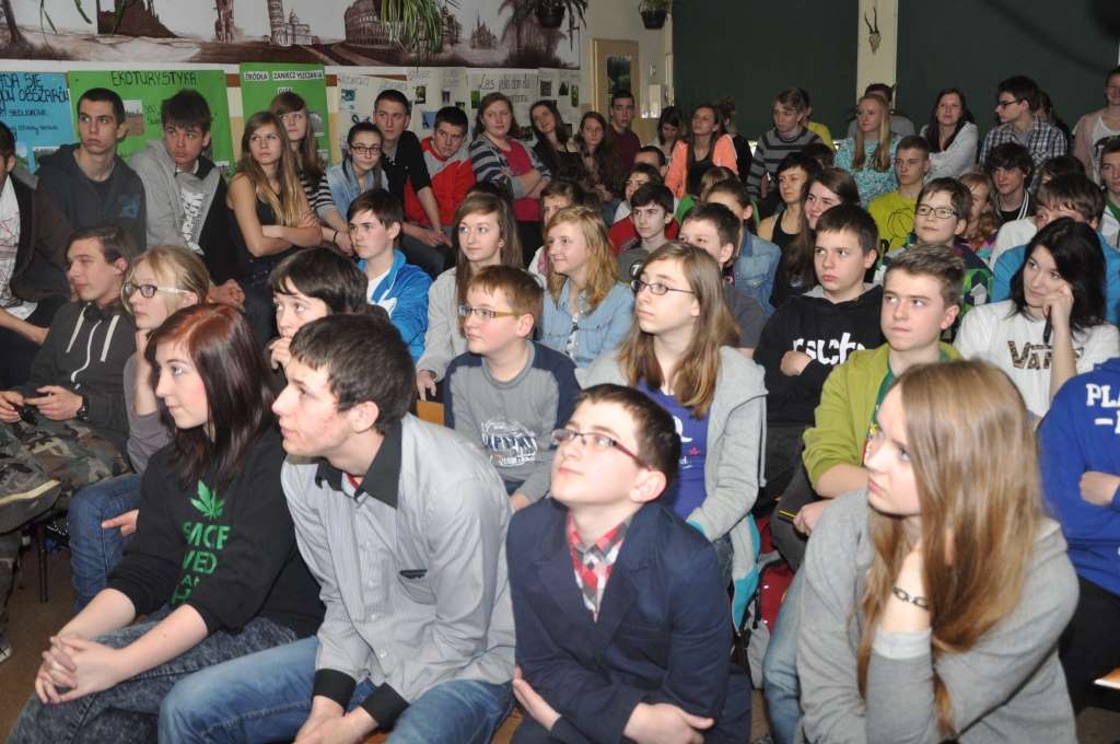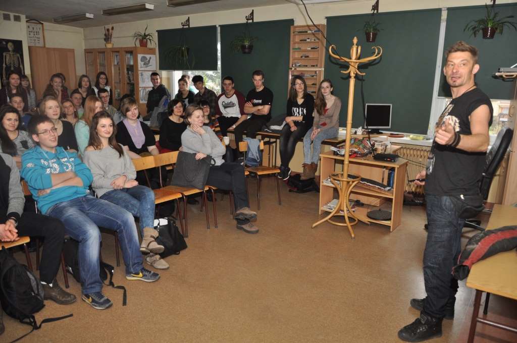 W środę 19 marca gościł w naszej szkole fantastyczny prelegent kryjący się pod pseudonimem Arun. W ciągu sześciu godzin zaprezentował dla trzech grup uczniów swoje wyprawy do Indonezji i na Madagaskar, wzbudzając wielkie zainteresowanie, pobudzając jednocześnie do refleksji jak i do śmiechu. W niekonwencjonalny sposób przedstawił wrażenia z pobytu wśród mieszkańców odwiedzanych regionów, ich tradycje, sposób życia, jednocześnie zaprzyjaźniając się z wieloma z nich, goszcząc w ich wioskach. O dziwo, swoje trwające nawet ponad miesiąc podróże, realizował (nie licząc przelotów) za dosłownie kilkadziesiąt dolarów. A oto fragment relacji z wyprawy na Madagaskar (http://arunmilcarz.pl/): „Dotarłem… prawie dotarłem do Beroroha. Do osiągnięcia celu zostało dziesięć kilometrów marszu. Noc i dzień skakaliśmy ciężarówką rozpędzoną do 8 km/h. Siła z jaką dziury w quasi drodze miotały nią pionowo i poziomo przypominały siłę podmuchów polskiego halnego. Oparcia siedzeń odrywały się i latały od burty do burty. Można by pomyśleć, że w końcu ktoś nie da rady, zacznie chociażby narzekać. Ludzie jednak śmieją się, żartują. Awaria akumulatora wywołuje serię rozbuchanych śmiechem komentarzy. Malgasze zrozumieli, że śmiech zabija pośpiech i stres, że nie ma co walczyć z tym co się przydarza, bo wszystko co nieprzewidziane to równorzędny element życiowej układanki jak to co zaplanowane. Tak więc z niezmienną radością powitali wiadomość, że to nikt inny jak ciężarówka nie dała rady i ostatnie dziesięć km będziemy iść własnonożnie obuci w klapki”.