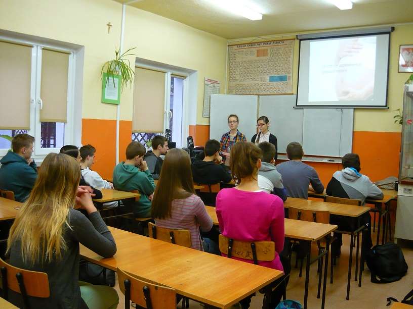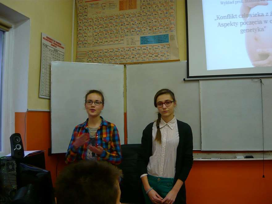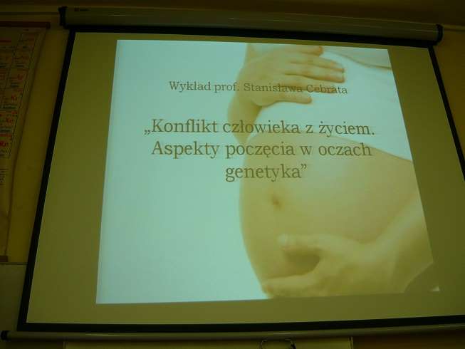 Wykład pt.: "Konflikt człowieka z życiem - aspekty poczęcia w oczach genetyka" poprowadził prof. dr hab. Stanisław Cebrat, genetyk, prodziekan Wydziału Biotechnologii Uniwersytetu Wrocławskiego. Po wykładzie profesor odpowiadał na wiele pytań od uczestników. Na sali byli uczniowie, nauczyciele, studenci oraz mieszkańcy Obornik i okolic. Sala pękała w szwach. W kominku przepięknie odremontowanej sali dębowej strzelał ogień. Panowała miła atmosfera. Po wykładzie w Bagnie uczniowie opowiadali w szkole o tym, co usłyszeli. Poniżej zdjęcia z lekcji w klasie 1B, którą prowadziły Aleksandra Woźniak i Sylwia Mirek.
