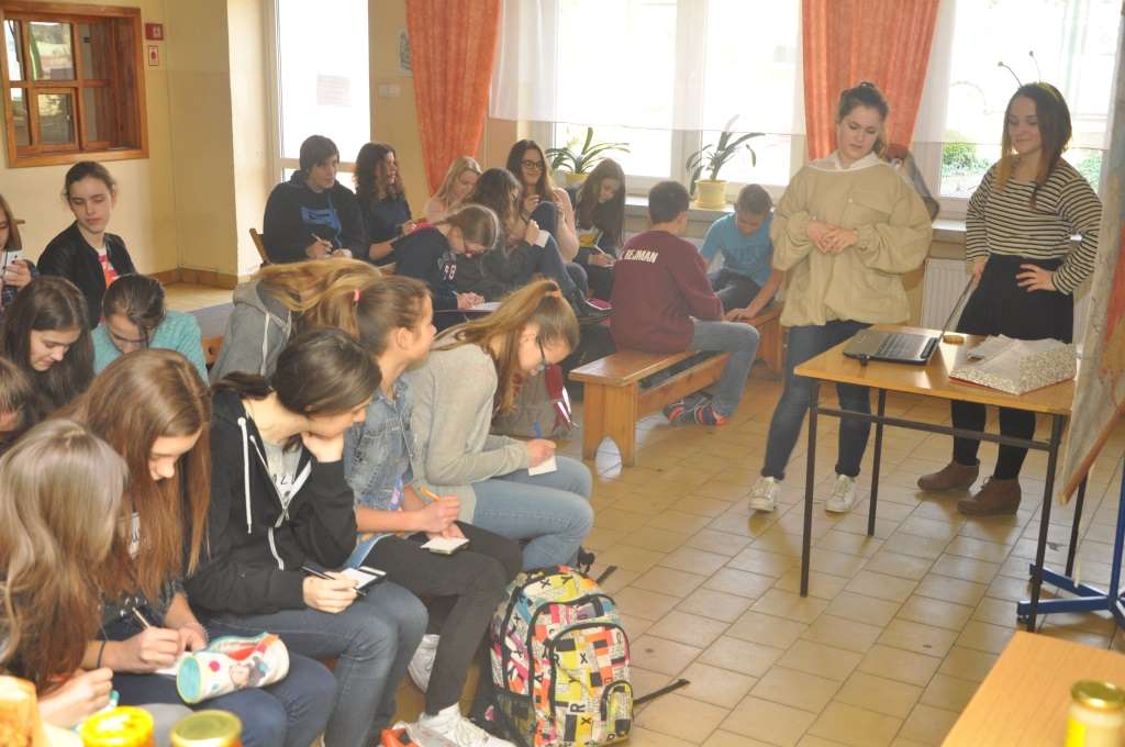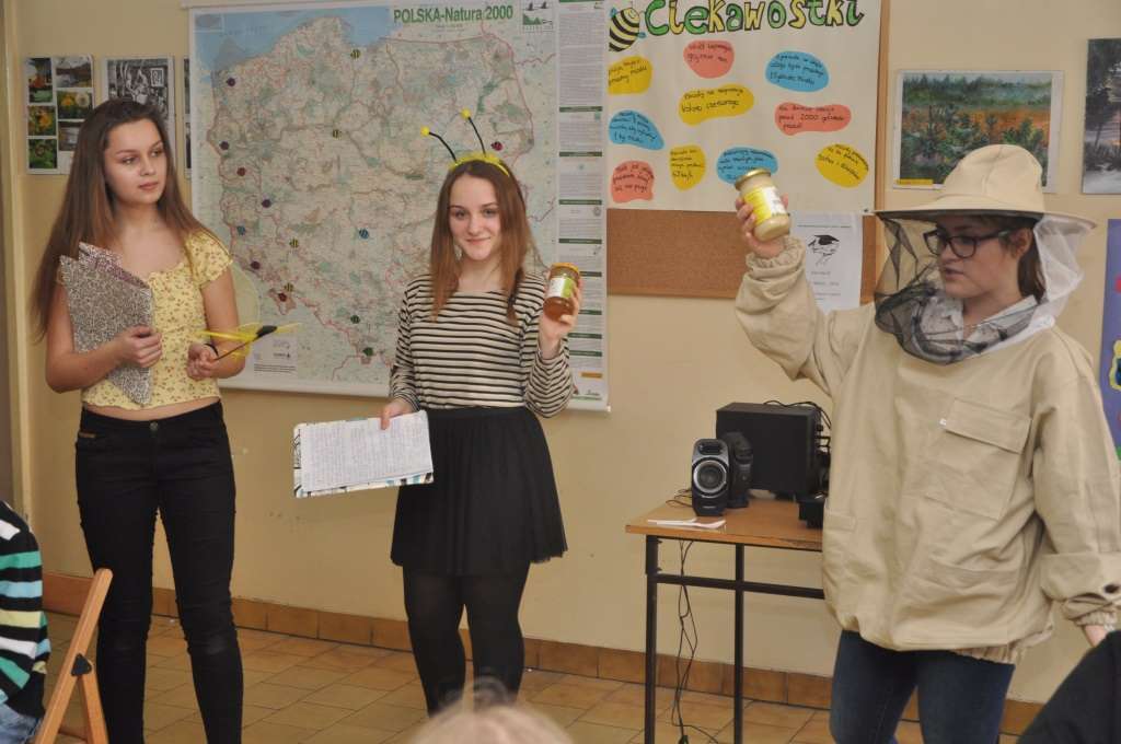 W poniedziałek 14 marca uczennice klasy 2 gimnazjum Klaudia Kwietniewska, Michalina Stempin i Anna Syrnik zaprezentowały efekty pracy wykonanej pod opieką p. Artura Przystarza w ramach Projektu Gimnazjalnego. Uczennice przeprowadziły dla klas gimnazjalnych prelekcję dotyczącą miodu, życia i hodowli pszczół. Został również zorganizowany sklepik z własnoręcznie przygotowanymi miodowymi pysznościami, sprzedawane były m.in. ciasta, sałatki, kanapki oraz gorąca herbata, które cieszyły się dużym zainteresowaniem wśród uczniów i nauczycieli. W ramach sprawdzenia wiedzy dotyczącej tematyki projektu wśród uczniów przeprowadzone zostały quizy, najlepsi zostali nagrodzeni niespodziankami.