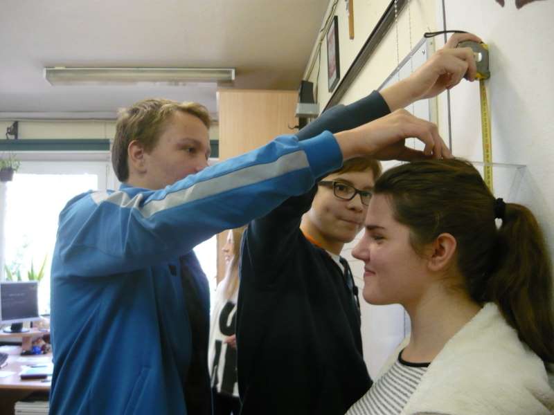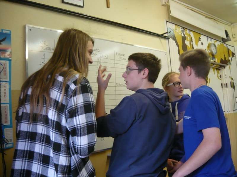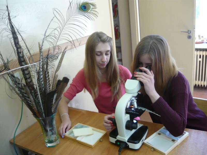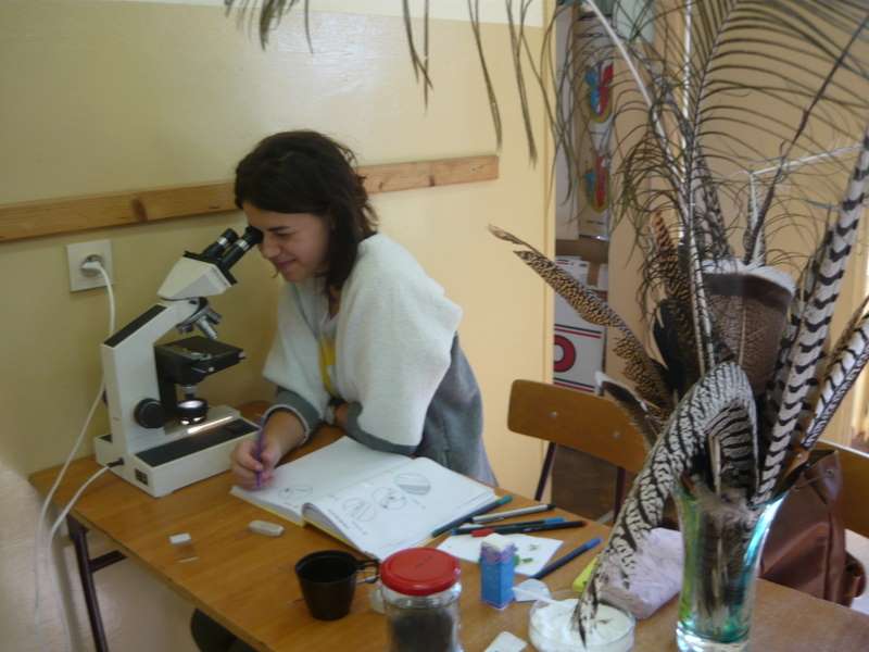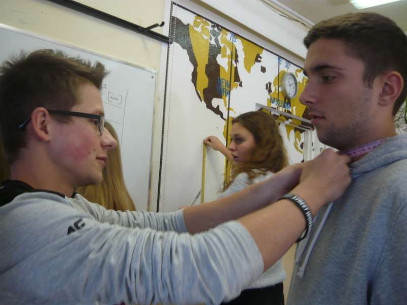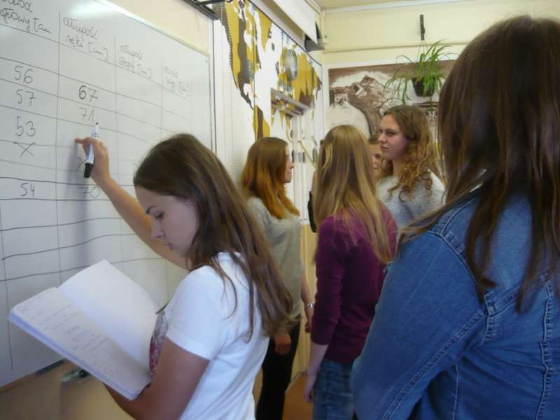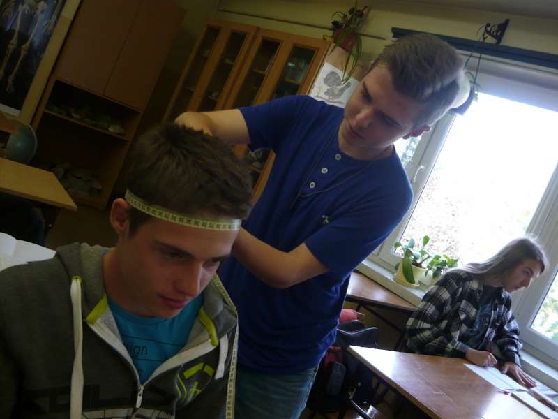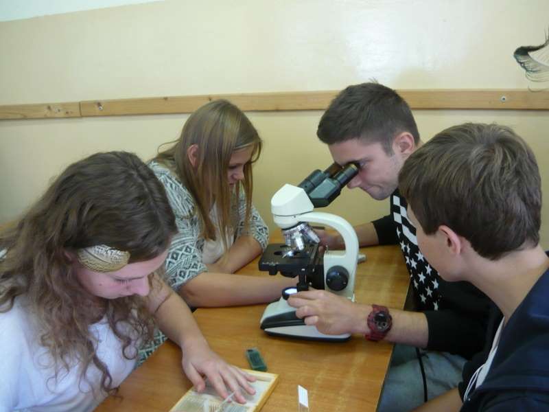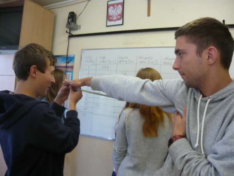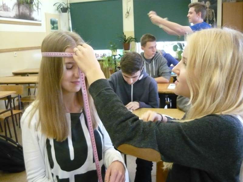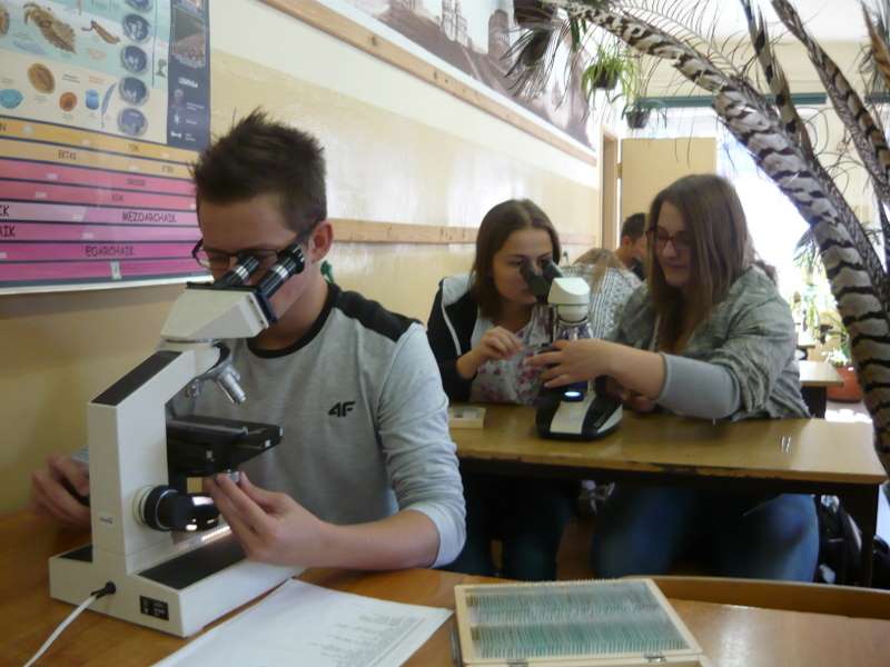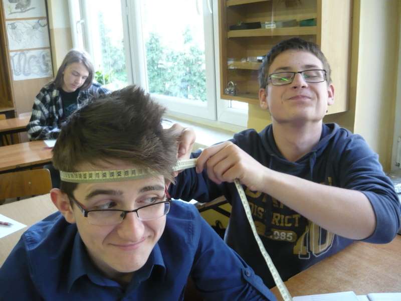 Poniżej fotorelacja z lekcji biologii, które odbyły się w październiku w klasie drugiej i trzeciej przyrodniczej oraz w klasie trzeciej gimnazjum. Taka nauka przez zabawę. Uczniowie "własnoręcznie" poznali pojęcie zmienności w obrębie gatunku, badając różne cechy biometryczne człowieka, np. wysokość ciała, obwód głowy, długość ręki czy stopy. Dane były zapisywane do tabeli, po czym uczniowie dla każdej cechy liczyli średnią arytmetyczną i odchylenie standardowe. Dane przedstawiali graficznie za pomocą diagramów i samodzielnie formułowali wnioski. Można też było zaprzyjaźnić się z mikroskopem, wykonując własne preparaty mikroskopowe. Materiał do obserwacji pochodził m.in. z domowej hodowli pleśniaka na pożywce z chleba.