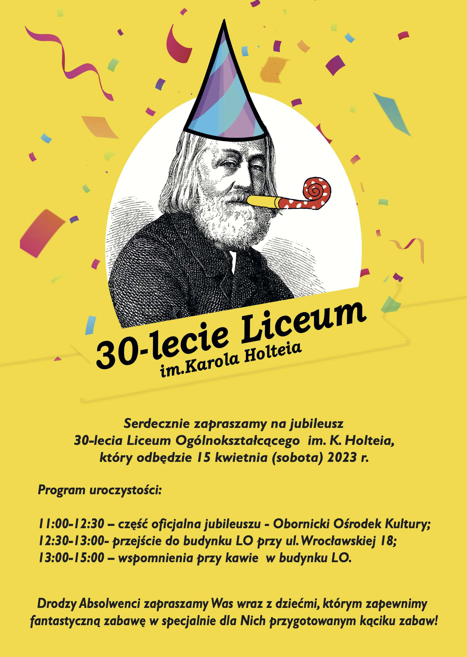 Serdecznie zapraszamy na jubileusz 30-lecia Liceum Ogólnokształcącego im. K. Holteia, który odbędzie 15 kwietnia (sobota) 2023 r.