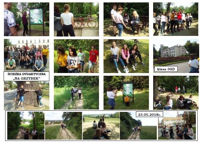 Dnia 23 maja uczniowie klasy 3GD wzięli udział w wycieczce ścieżką dydaktyczną "Na Grzybek". Ścieżka składa się z 9 stacji, które rozmieszczone są na terenie Obornik Śląskich. Ścieżka rozpoczyna się i kończy przy dworcu PKP. Przy każdej stacji znajduje się tablica informacyjna zawierającą historię miejsca oraz opis ciekawych gatunków. Materiał zebrany podczas wyjścia posłuży do opracowania filmów i prezentacji, które zostaną umieszczone na stronie szkoły.