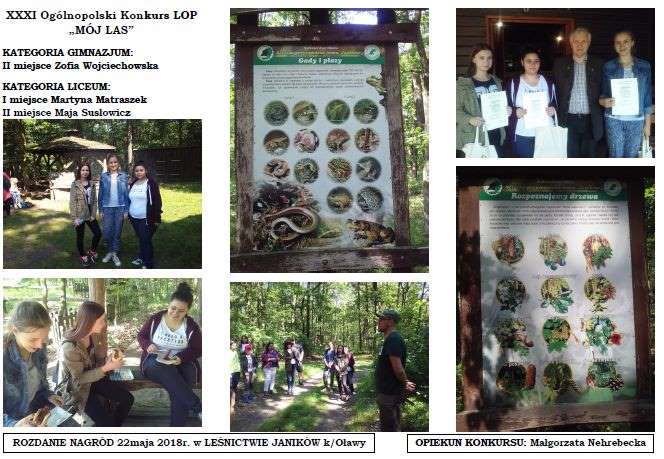 Dnia 22 maja 2018 r. miało miejsce rozdanie nagród w XXXI Ogólnopolskim Konkursie LOP "Mój las", w którym uczestniczyły 2 uczennice LO: Martyna Matraszek (2LOa) - zdobywczyni I miejsca, Maja Susłowicz (2LOa) - zdobywczyni II miejsca oraz uczennica 3 klasy Gimnazjum Zofia Wojciechowska - zdobywczyni II miejsca.